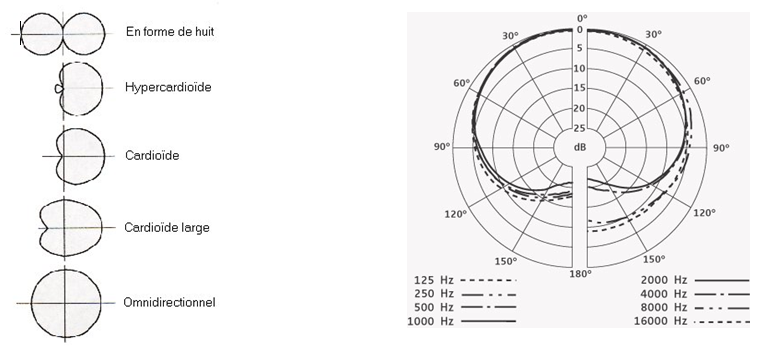 Directivity of a loudspeaker or microphone : Vertical and horizontal angle of sound dispersion from the axis of the loudspeaker depending on the frequency. The most used directivity for microphone are: cardioid, hyper-cardioid or omnidirectional. They are given by a polar diagram.