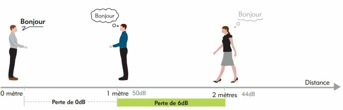 The sound level pressure in dB (SPL) decrease of 6 dB in free field when the distance is doubled :