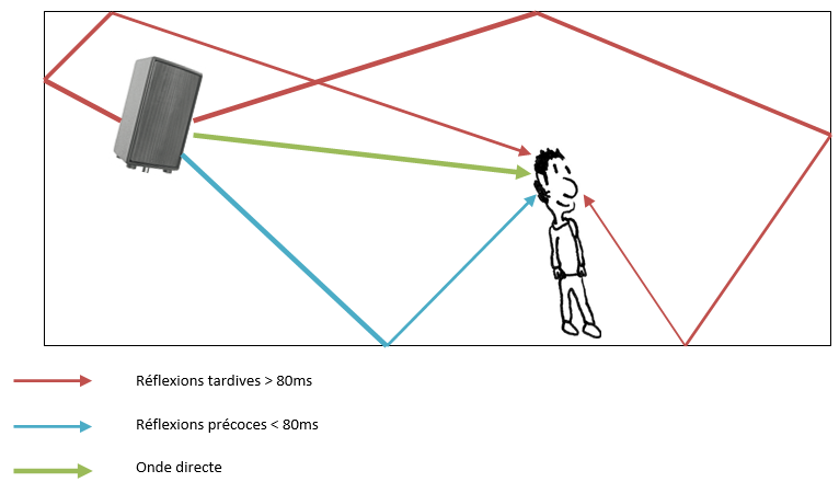 Reflections : Reflection is a phenomenon caused when a sound wave encounters an obstacle. There are two types of reflection: early reflections (important for intelligibility) and late reflections (harmful for intelligibility).