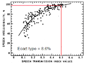 Intelligibility : Percentage of message comprehension. This percentage depends on the ratio between the direct wave and the reflected wave, and on the reverberation time. It is expressed in RASTI, STI or CIS. The higher the percentage, the better the intelligibility.