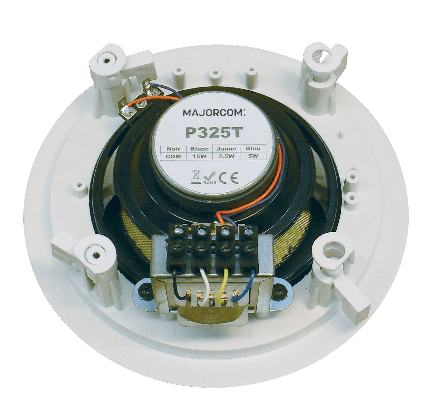 • Ceiling speaker equipped with a 6.5“ 2-way fibreglass loudspeaker and a 100V high quality transformer.