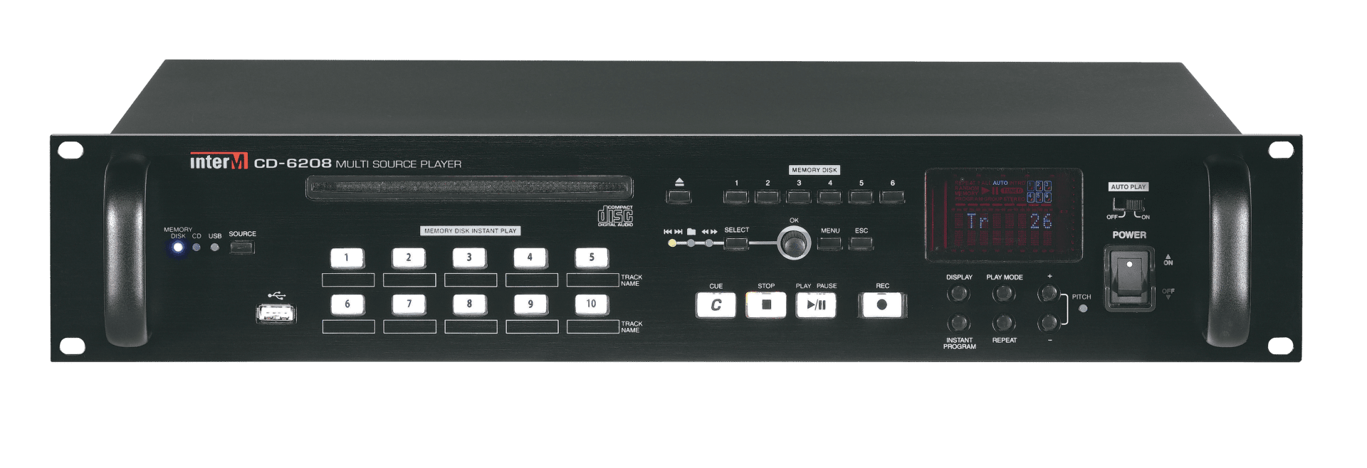 Lecteur professionnel multi-sources USB/CD avec mémoire SD interne.