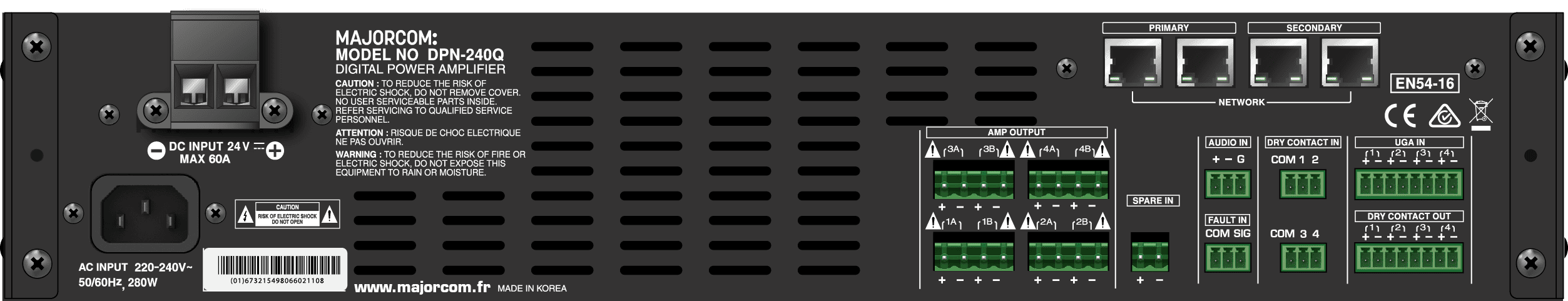Puissance | 4 x 240 W RMS @ 70 V/100 V Classe D Charge Min 41.6 Ω, Capacitée Min 0.01uF | |