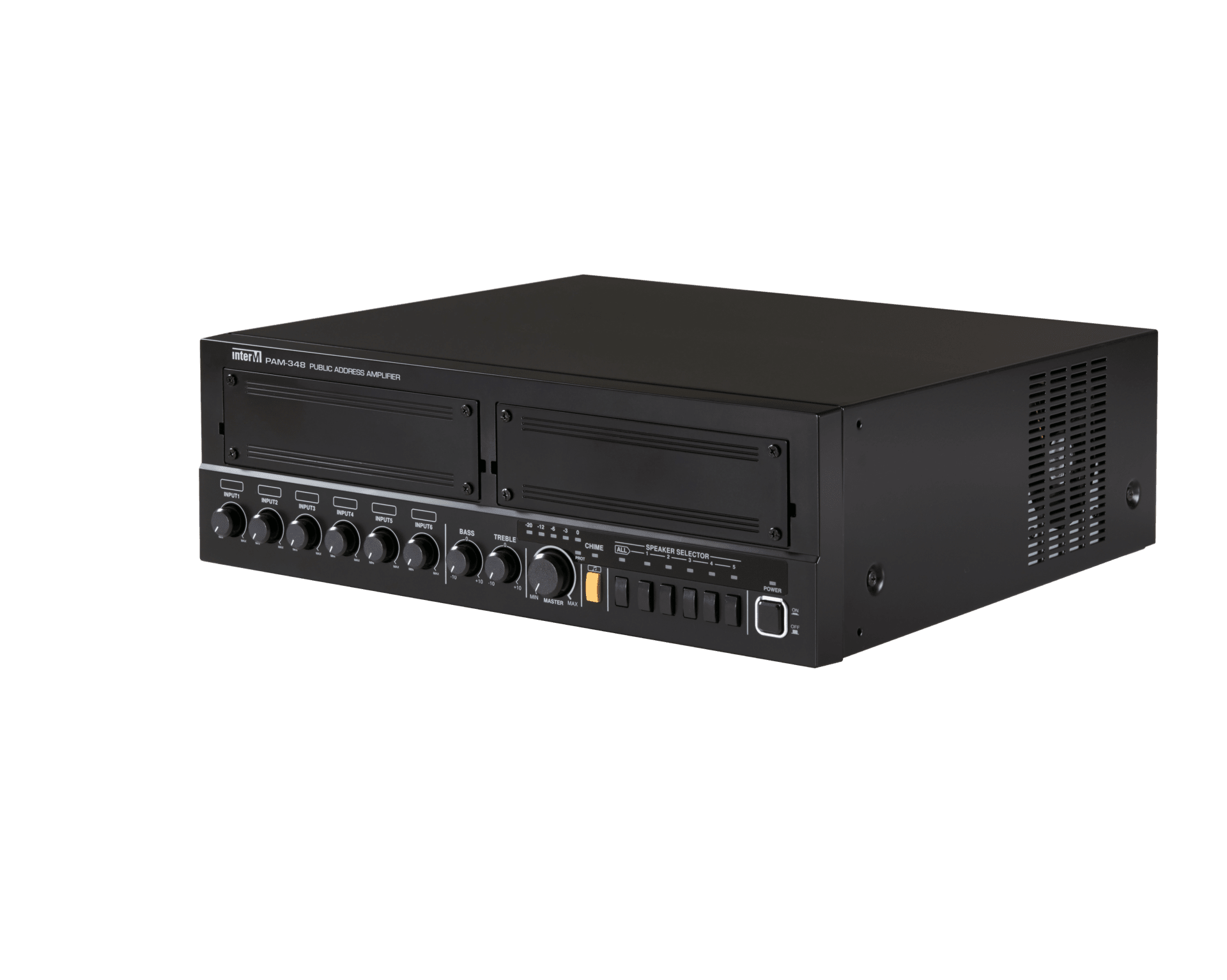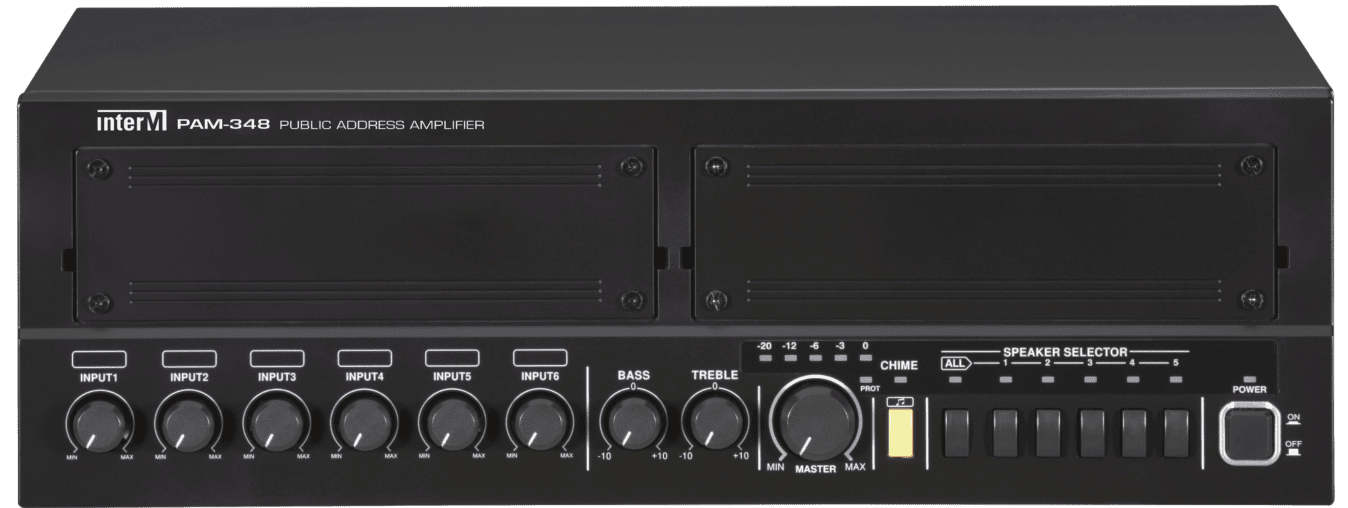 - 5 Sorties ligne Hautparleur activable ou pas en face avant idéal pour faire de l’appel sélectif via le pupitre MICRO RM-05 sur 5 Zones.