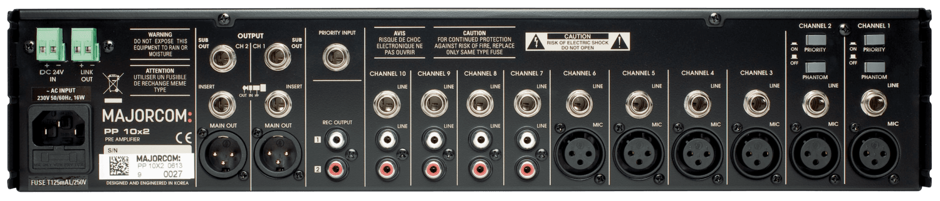 • Les 10 entrées se décomposent de la façon suivante : – 6 entrées Micro /Ligne (CH 1 à CH 6) dont 2 sont prioritaires et pourvues d’une alimentation phantom – 4 entrées Ligne (CH 7 à CH 10) – 1 entrée super prioritaire 0 dB.