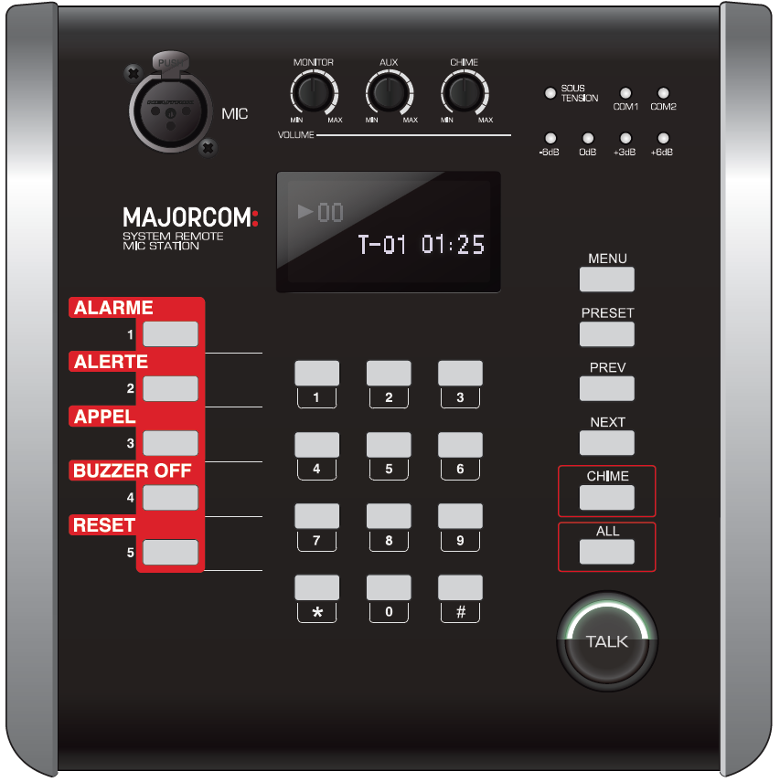 En mode sécurité le pupitre d’appel est totalement supervisé et permet de lancer un appel d’urgence, ALARME, ALERTE. L’écran LCD confère à l’opérateur un contrôle optimal et un retour d’informations permanent.